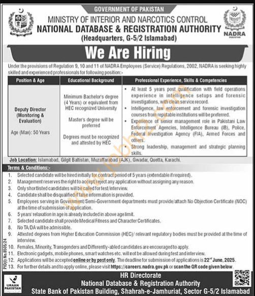 Tagged as: administration jobs, bachelor degree jobs, full time jobs in Islamabad, government jobs in Islamabad, government sector jobs, Islamabad jobs, jobs in G-5 Islamabad, jobs in Islamabad 2025, June 2025 jobs, latest jobs in Pakistan, management jobs, master degree jobs, NADRA careers, NADRA jobs, NADRA vacancies, National Database & Registration Authority jobs, Pakistani government jobs, Public Sector Jobs, The News Jobs