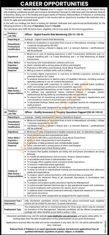 The selected candidates will work at NBP’s Karachi branches and contribute to the bank’s daily operations, customer service, and strategic goals. Responsibilities may include account management, transaction handling, compliance, and data analysis, depending on the role.