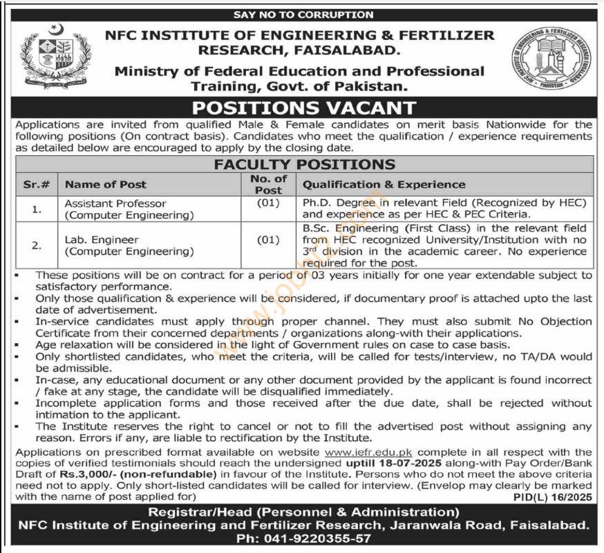 This job description is optimized for search engines by naturally including keywords such as “education jobs,” “government jobs in Faisalabad,” “full-time jobs,” “NFC Institute of Engineering and Fertilizer Research,” and “Faisalabad jobs.” It is clear, straightforward, and useful for job seekers looking for opportunities in the education and government sectors in Pakistan.